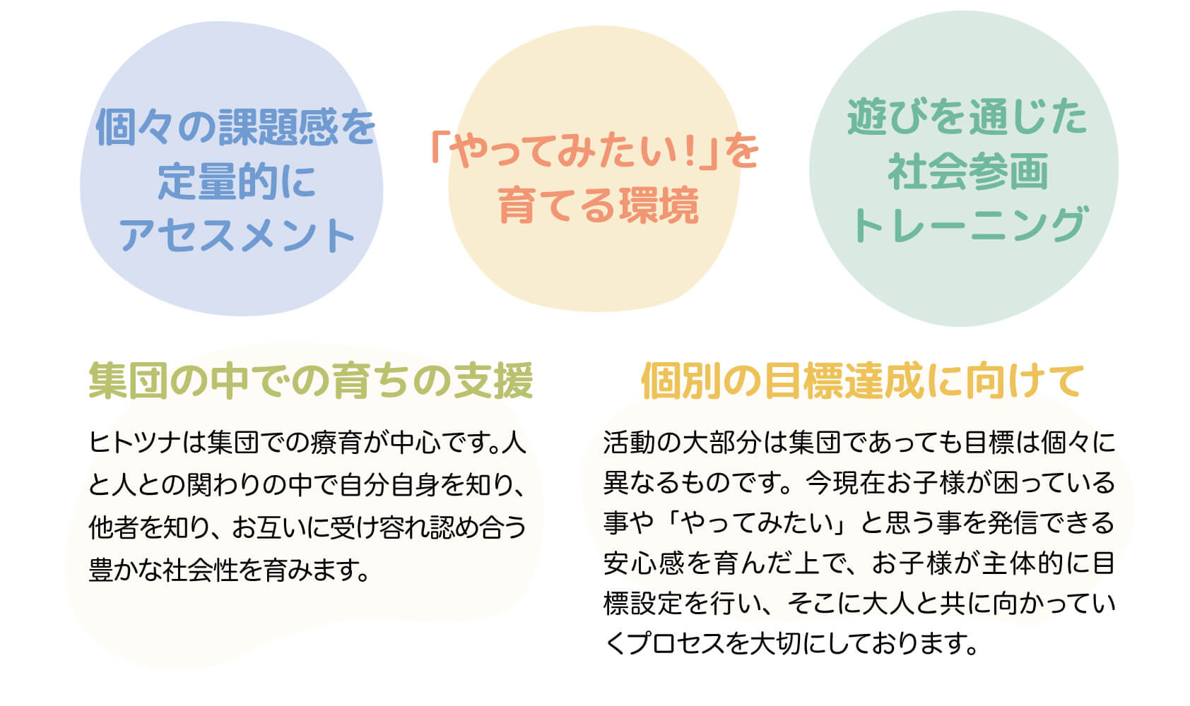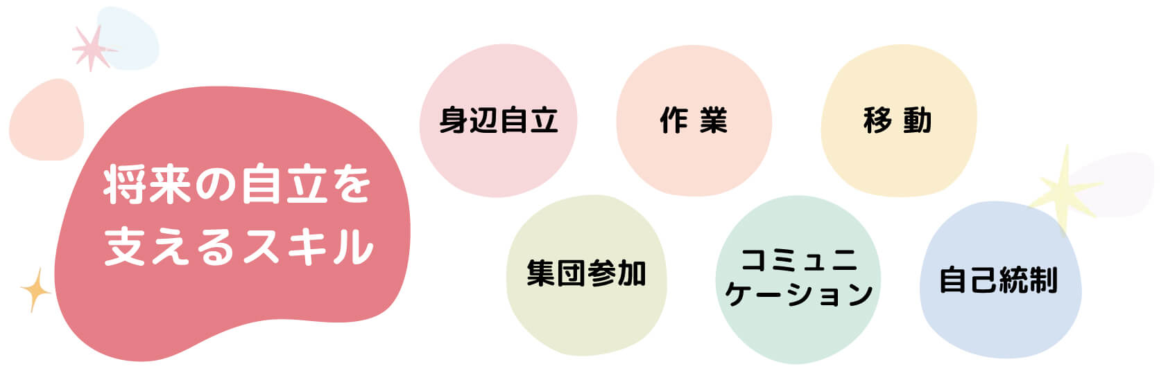 お友だち同士で楽しく活動しながら、コミュニケーション・役割理解・参加スキル体の動かし方などを学習します。
